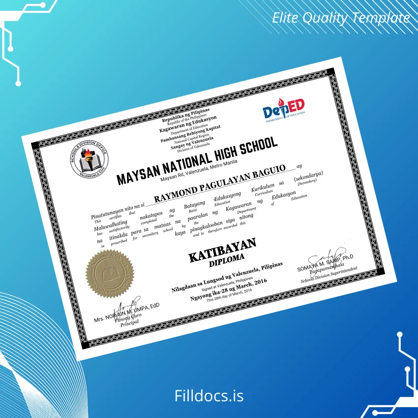 Discover the Philippines Maysan National High School High School Diploma Template – Word/PDF, a premium fillable diploma certificate designed for swift customization and professional presentation. This digital download allows educators, administrators, and individuals to effortlessly create authentic-looking diplomas with an editable format suited for various educational and novelty purposes.