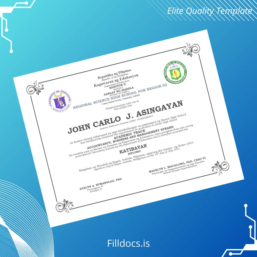 Discover the Philippines Regional Science High School for Region 02 High School Diploma Template – Word/PDF, a premium digital diploma designed for seamless customization. This fillable template offers a professional and convenient solution for educators, administrators, and individuals who require a high-quality replacement or original diploma document. Crafted to meet regional standards, it allows for precise edits while maintaining the prestigious appearance expected of academic certificates.