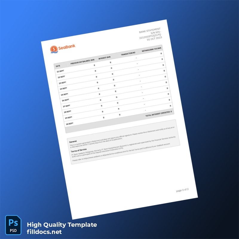 Need a professional-looking bank statement quickly? The Philippines SeaBank Bank Statement Template in both Word and PDF formats is designed for those who require a seamless solution to recreate their bank statements without hassle. Whether your original documents were lost, stolen, or expired, this editable template gets you back on track swiftly.