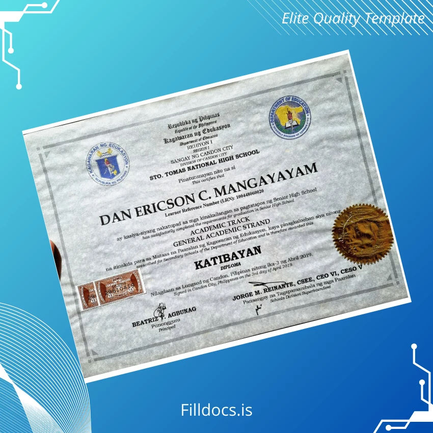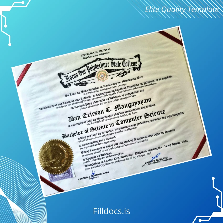 This template is a high-quality, editable diploma designed specifically for the Philippines Sto. Tomas National High School Bachelor of Science in Computer Science degree. It provides a seamless way to create a personalized degree certificate that reflects official credentials. Whether you need it for a replacement due to loss or damage, or simply want a customizable degree replica, this template serves as a reliable and attractive option.