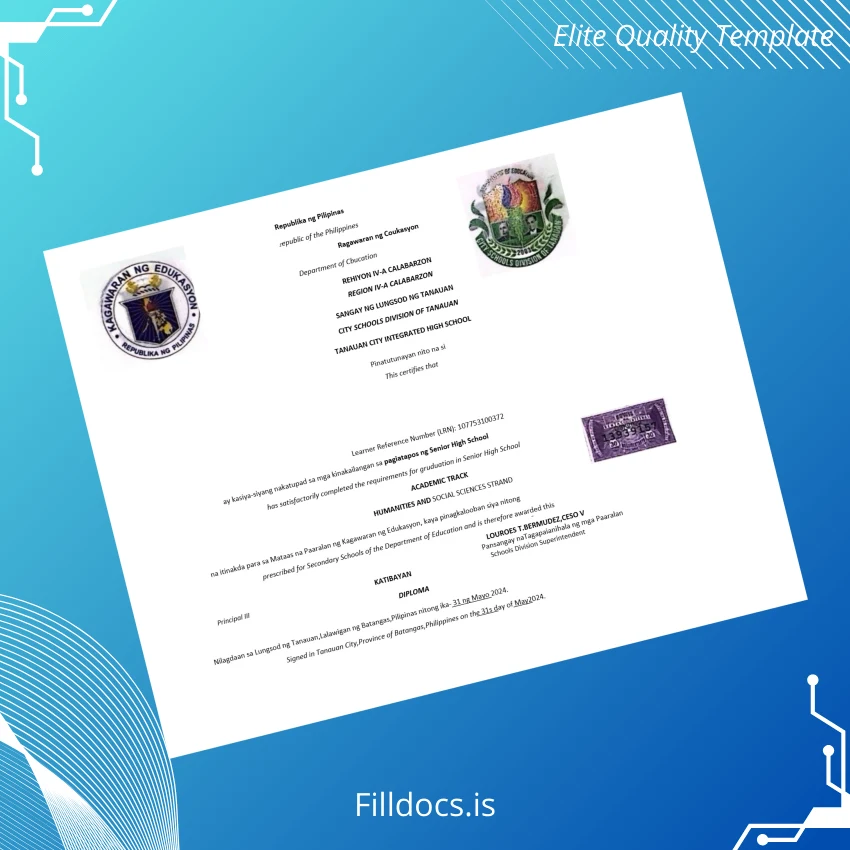 Discover the Philippines Tanauan City Integrated High School High School Diploma Template – Word/PDF, a high-quality, fillable certificate designed to meet professional standards. This editable diploma template provides an ideal solution for students and institutions needing a customizable, printable diploma that maintains an authentic and polished appearance.