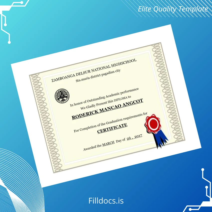 Fillable Philippines Zamboanga Delsur National Highschool Certificate Template – Word/PDF for easy, professional customization and print-ready diploma creation.