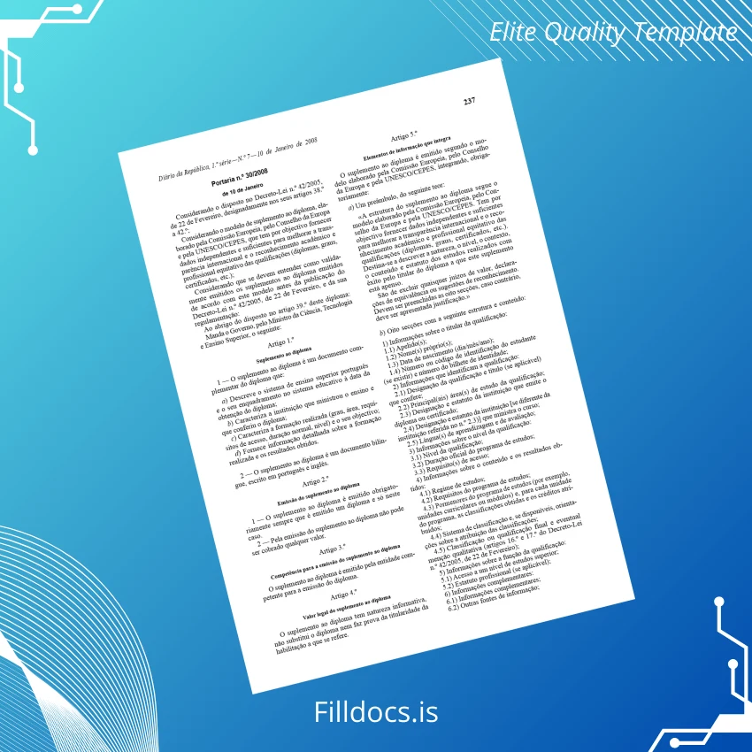 This template provides a comprehensive and authentic-looking diploma supplement specifically tailored for the University of the Azores. It serves as an official document supplement for graduates, ensuring that all educational achievements are clearly documented. Perfect for professionals needing a replacement diploma or academic supplement, the design maintains accuracy and visual integrity while allowing for full customization.