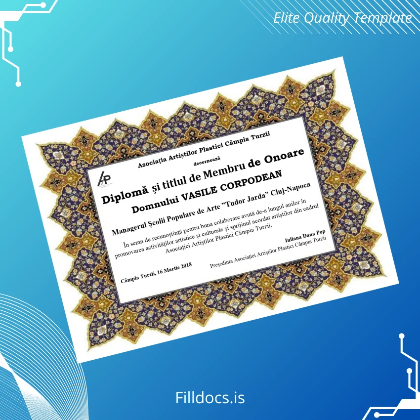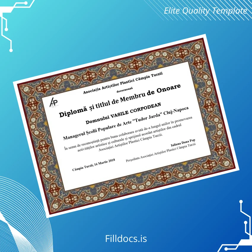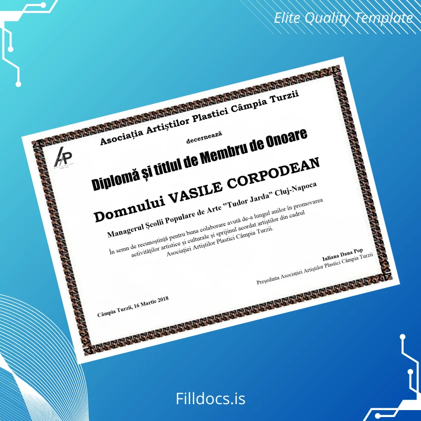 Discover the Romania Asociatia Artistilor Plastici Campia Turzii Honorary Member Diploma Template – Word/PDF, a versatile and fillable diploma designed for professionals who need a reliable, customizable certificate solution. This template is perfect for those requiring a replacement diploma or a blank form to personalize for honorary accolades, combining elegance with ease of use.
