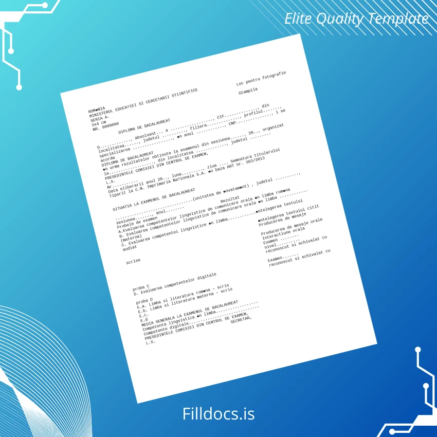 The Romania Bacalaureat Diploma Template – Word/PDF is a high-quality, fillable diploma certificate designed for professionals and institutions needing a reliable replacement or customizable document. Crafted with precision, this template offers a seamless solution for individuals who require an editable diploma form due to loss, damage, or simply for creating a polished presentation of academic achievements.