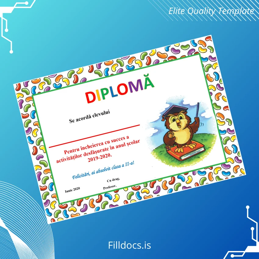 This is a highly editable and customizable diploma template designed specifically for the completion of 2nd grade in Romania. It comes as a digital diploma download compatible with both Word and PDF formats, allowing users to add their personalized details with ease. Crafted to replicate official diploma designs, it serves as a valuable tool for educators or anyone in need of a replacement diploma template.