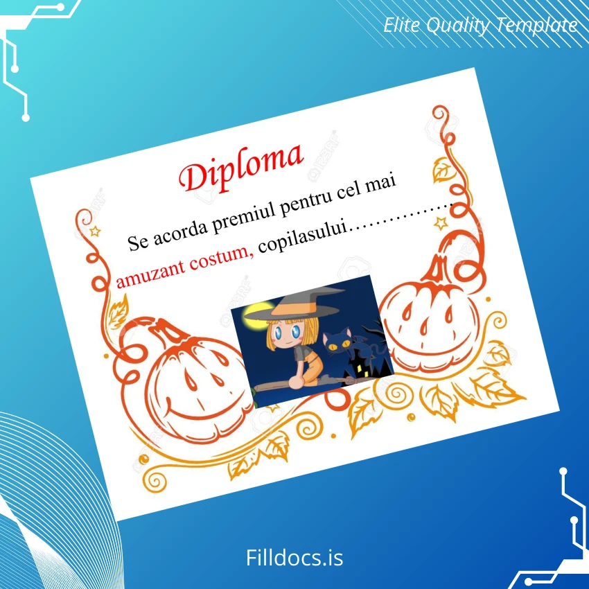 This fillable diploma template features a unique Halloween-themed design tailored specifically for Romanian diploma certificates. It serves as an editable document to create custom certificates, replacement diplomas, or fun degree mock-ups. Suitable for both professional and creative applications, it ensures your diplomas are visually striking and appropriately themed.