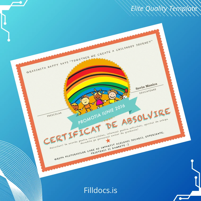 The Romania Grădinița Happy Days Preschool Certificate Template – Word/PDF offers a professional and customizable solution for awarding preschool achievements. Designed for educators and administrative staff, this fillable diploma template facilitates quick personalization, allowing users to create polished certificates suitable for printing or digital sharing with minimum effort.