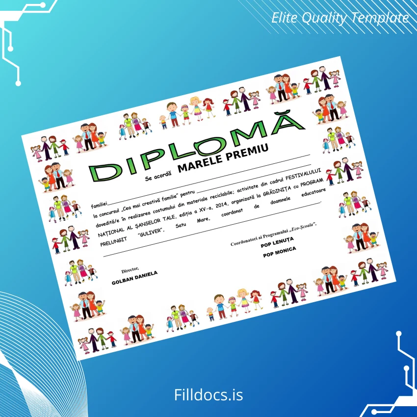 Discover the Romania Guliver Kindergarten Eco Costume Diploma Template – Word/PDF, a professional-grade, fillable diploma designed for kindergarten achievement recognition. This digital diploma facilitates quick creation of personalized certificates with a clean, eco-friendly design theme ideal for educational institutions and event organizers.