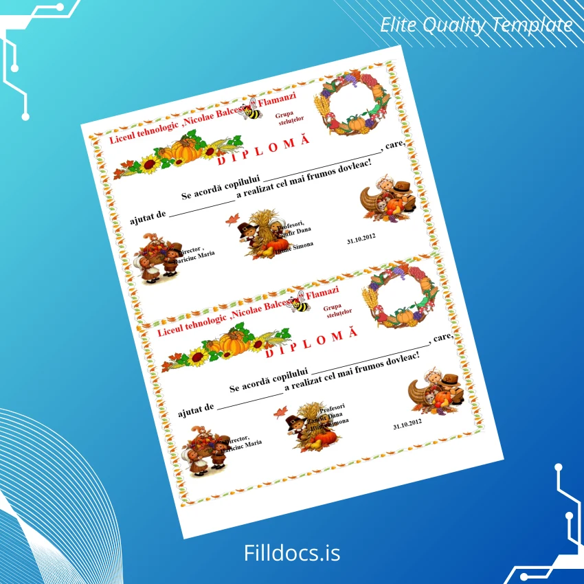This template is a fillable diploma certificate crafted specifically to replicate the official Romania Liceul Tehnologic Nicolae Balcescu Flamazi diploma format. It delivers a versatile, blank diploma form in both Word and PDF formats, enabling users to effortlessly personalize and generate diplomas without specialized graphic design skills.