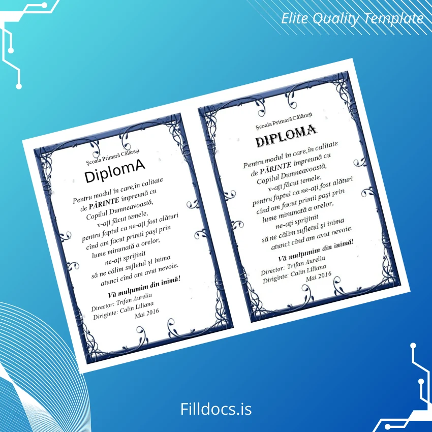The Romania School of Călărași Parent Diploma Template – Word/PDF is a professionally designed, fully editable certificate template tailored for educational institutions, parents, and administrators requiring a polished and customizable diploma document. This digital diploma download enables users to effortlessly input personalized details, ensuring seamless creation of a formal diploma with a novelty diploma design that maintains official standards.