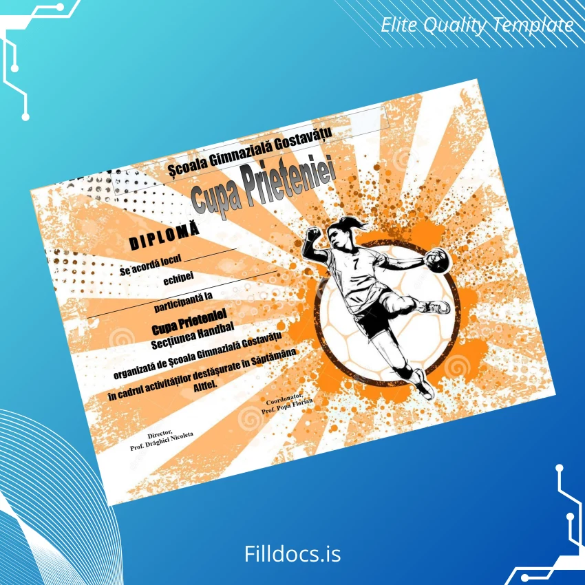 Discover the Romania School of Gostavățu Cupa Prieteniei Diploma Template – Word/PDF, a high-quality, fillable diploma design tailored for professionals seeking a customizable and print-ready degree certificate. This template meets the demands of educators, institutions, and individuals who require a fast, reliable digital diploma download with editable fields for seamless personalization.