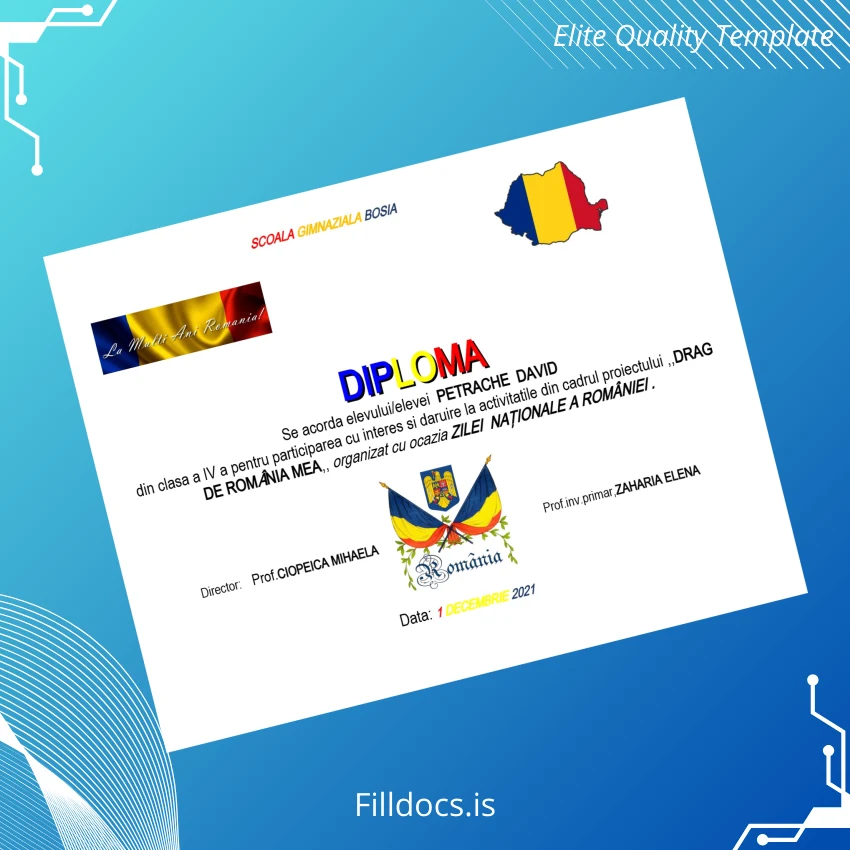 This is a high-quality, editable diploma certificate template specifically tailored for Romania Scoală Gimnazială Bosia. The template is provided in versatile Word and PDF formats allowing detailed customization. It serves as a blank diploma form that users can fill in digitally, making it ideal for those requiring a replacement diploma template or a novelty diploma design for commemorative purposes.