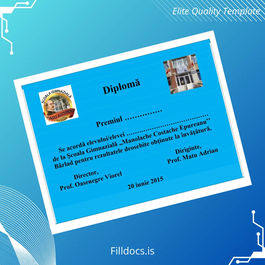 Discover the Romania Scoala Gimnaziala Manolache Costache Epureanu Diploma Template – Word/PDF, an expertly crafted fillable diploma certificate designed to meet professional standards for education and certification documents. This custom diploma template offers a seamless solution for schools, institutions, or individuals in need of a replacement diploma or a new certificate design featuring editable fields and modern styling.