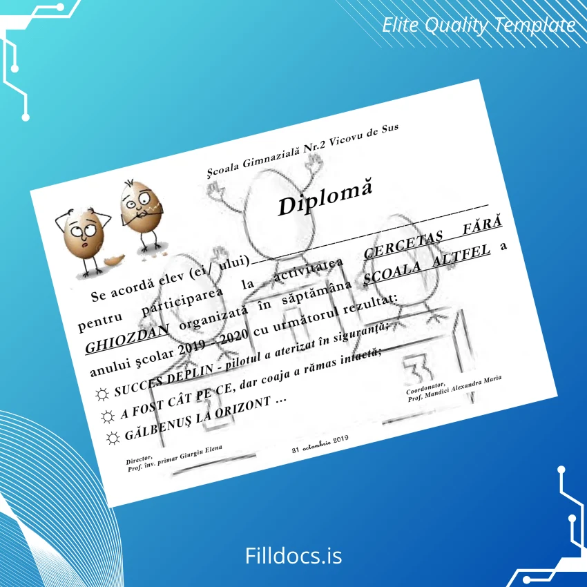 Discover the Romania Şcoala Gimnazială Nr.2 Vicovu de Sus Participation Diploma Template – Word/PDF, a professionally designed, editable diploma form tailored for educators, administrators, and academic institutions. This fillable template offers a seamless way to create authentic participation diplomas, featuring customizable fields where you can easily enter names, dates, and other essential details without hassle. Ideal for those who need a quick and elegant replacement diploma or a novel digital diploma download, this design balances tradition and modernity effortlessly.