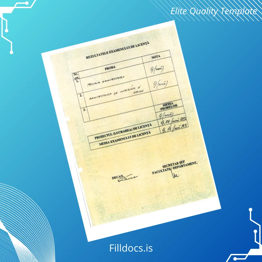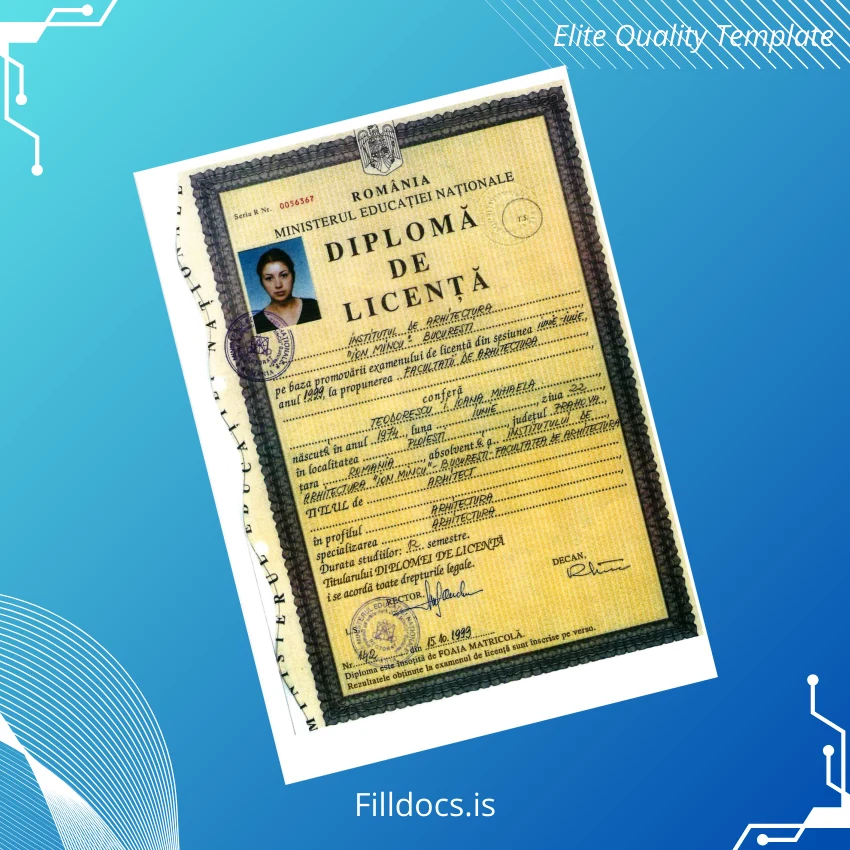 This editable diploma template is a meticulously crafted digital document available in both Word and PDF formats, designed to replicate the official licensure diplomas issued by Romanian universities. It serves as an ideal replacement diploma template for those who need a blank diploma form that is easy to customize while maintaining authenticity in appearance. Whether for professional presentations, academic purposes, or legal replacements, this template offers a sophisticated and novel diploma design tailored to meet precise educational standards.