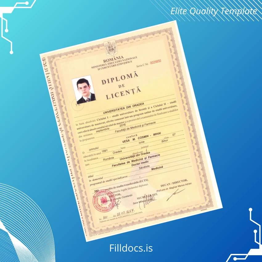 This Romania University of Oradea Doctor of Medicine Template combines professional design standards with user-friendly editability, making it an essential resource for graduates, educational institutions, or anyone in need of a reliable, quality diploma template.