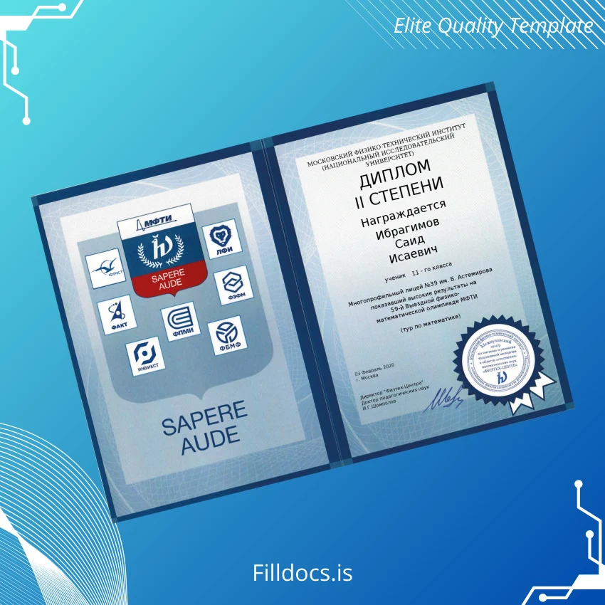 Discover the Russia Moscow Institute of Physics and Technology Diploma II Degree Certificate Template – Word/PDF, a high-quality fillable diploma form designed for professionals seeking a customizable and replacement diploma design. This editable document template offers seamless integration with both Microsoft Word and PDF formats, ensuring versatile usability for editing, printing, and digital sharing.