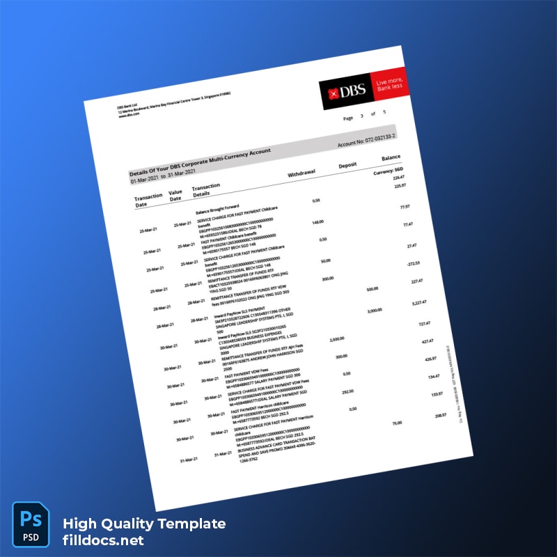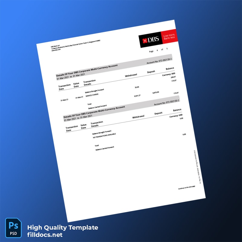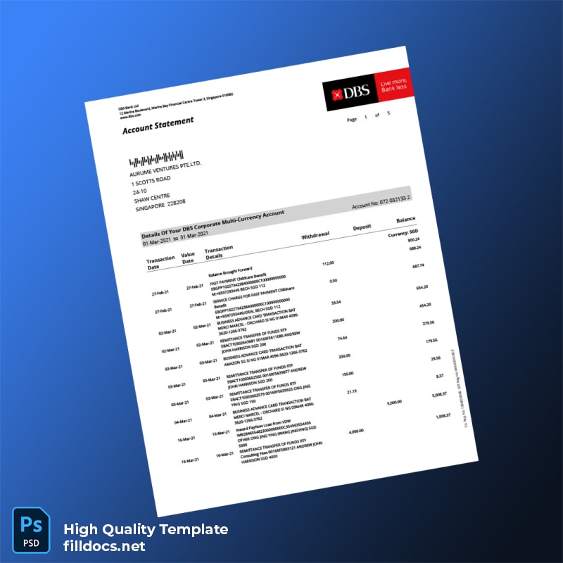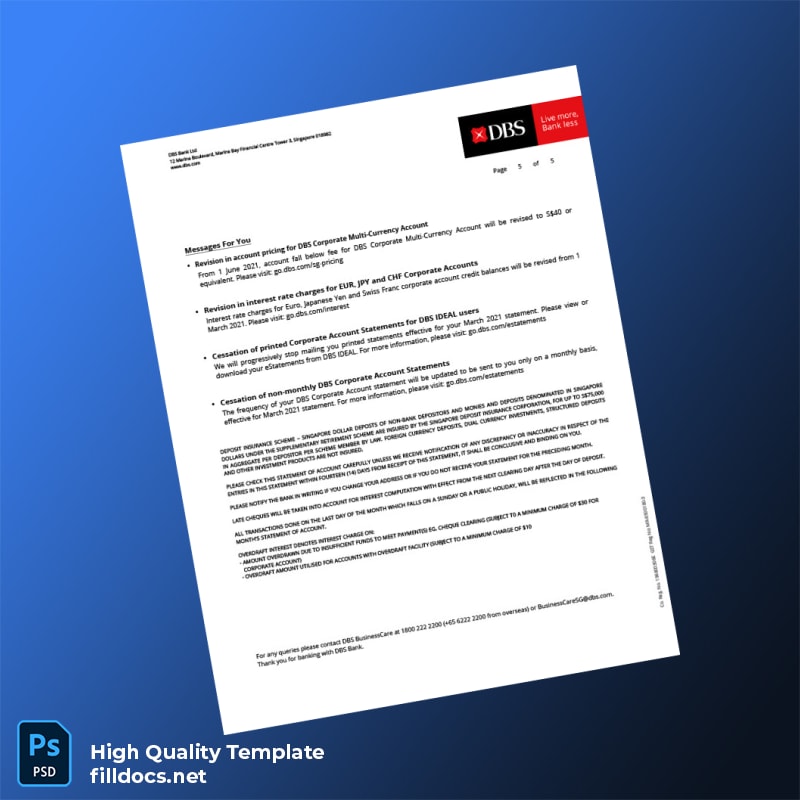 Singapore DBS Account Statement Template in Word and PDF formats 5 page