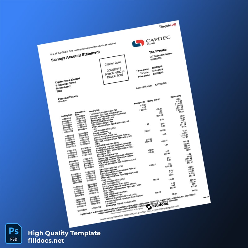 Picture this: you’ve lost your bank statement, and you need to submit your financial records immediately for a loan application. Having faced this challenge, many professionals find themselves scrambling without a solution. With our editable bank statement template, you can swiftly recreate your Capitec Bank Statement with minimal hassle.