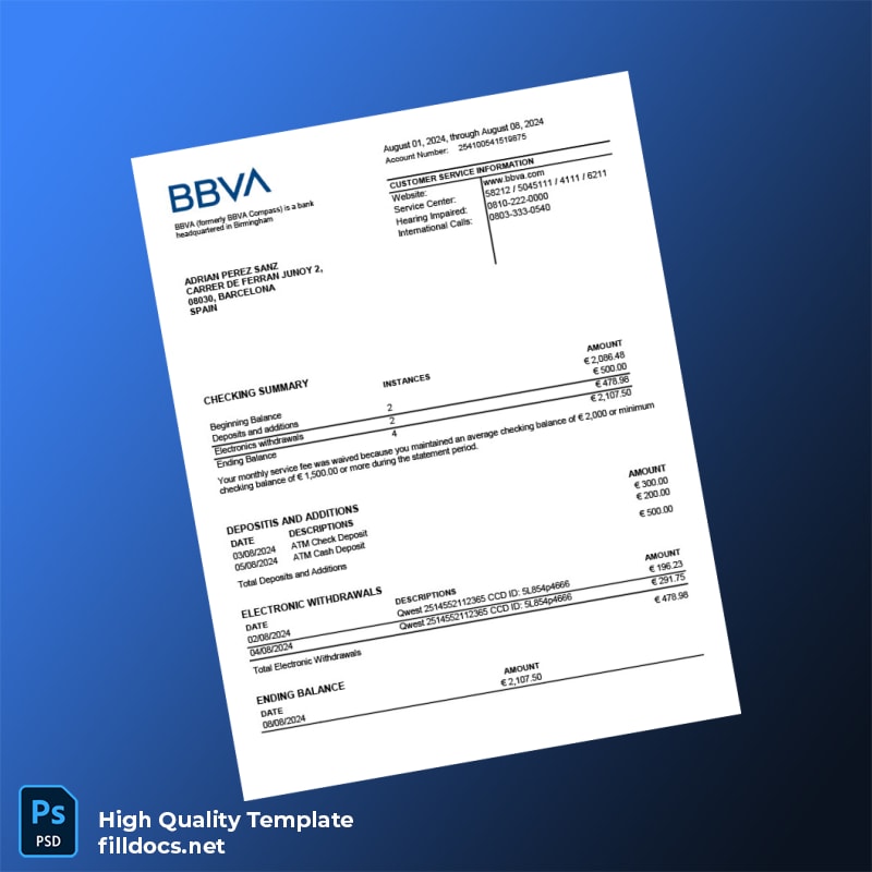Spain BBVA Bank Statement Template in Word and PDF formats