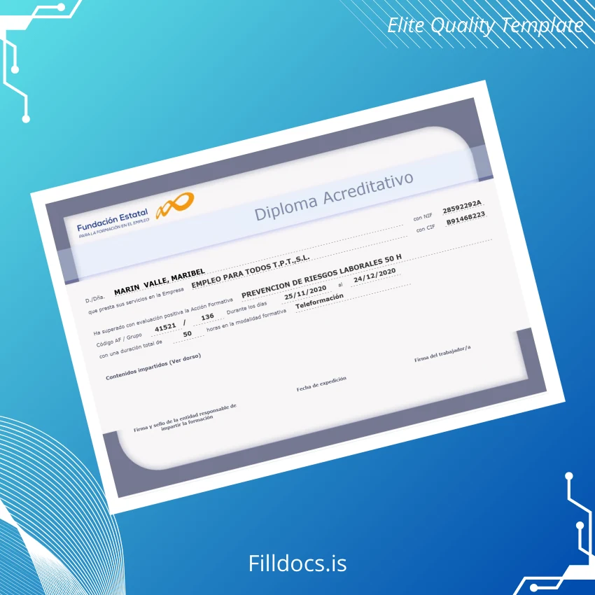 The Spain Employment for All S.L. Diploma in Occupational Risk Prevention 50 Hours Certificate Template is a professionally designed, fully customizable digital diploma that enables you to quickly create authentic replacement certificates or novelty diploma designs. This fillable template is ideal for professionals needing an editable diploma form that maintains official appearance and high standards for occupational safety and risk prevention credentials.