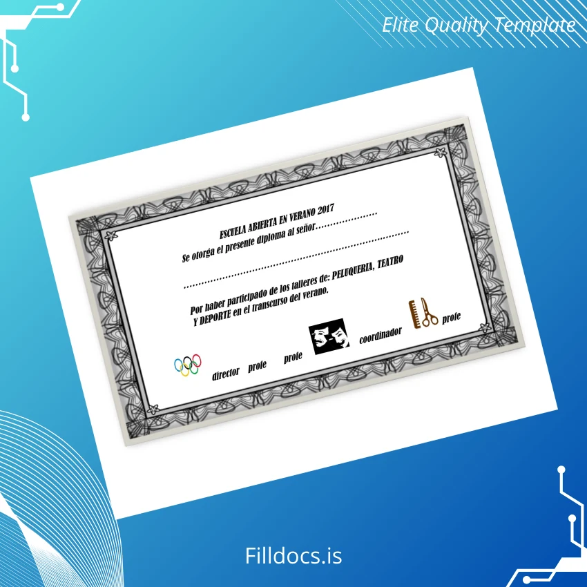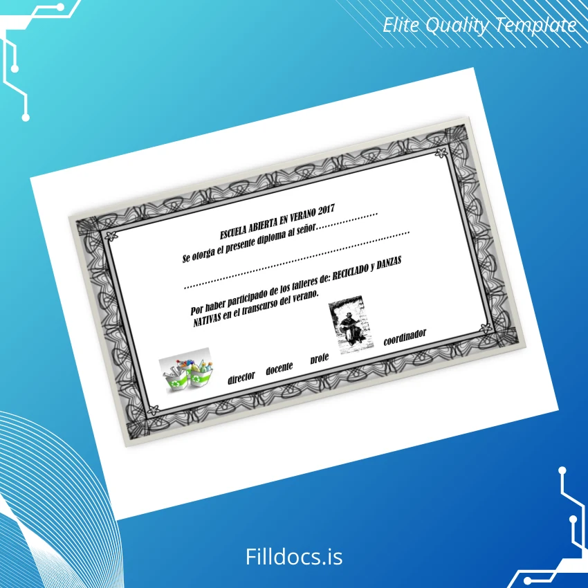 The Spain Escuela Abierta Summer School Diploma 2017 Template – Word/PDF is a professionally designed, fillable certificate template ideal for educators, administrators, and institutions needing a customizable diploma form. This digital diploma download provides a seamless way to produce official-looking credentials with ease by allowing users to input specific details directly into the ready-made text fields.