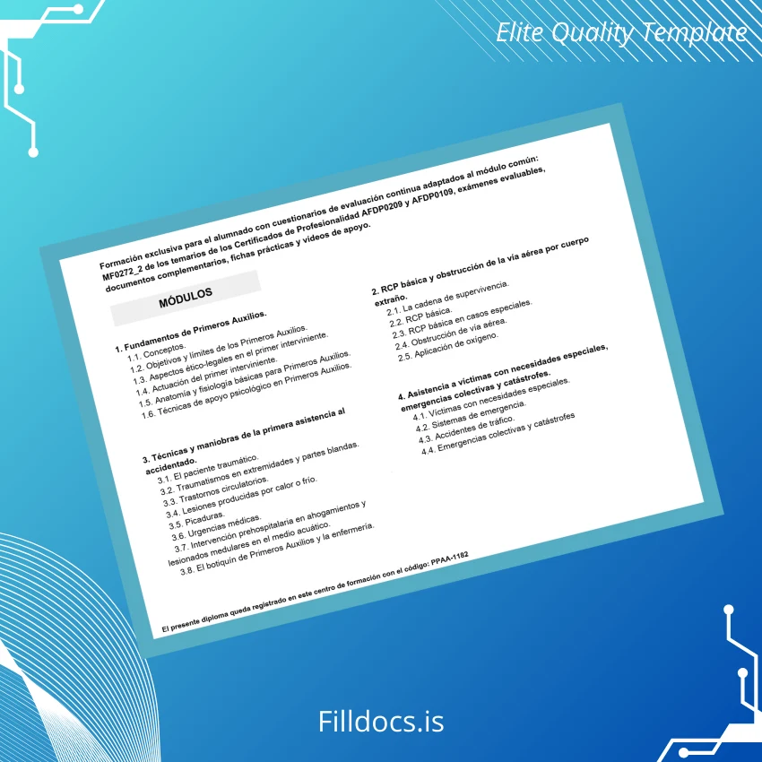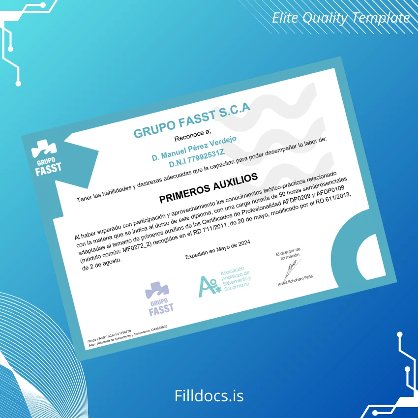 The Spain Grupo Fasst First Aid Diploma Template – Word/PDF is a professional, fillable certificate designed for quick and easy customization. Ideal for professionals who need a reliable replacement diploma template or a crisp digital diploma download, this product offers a high-quality and editable diploma template that balances traditional design with modern editing convenience.