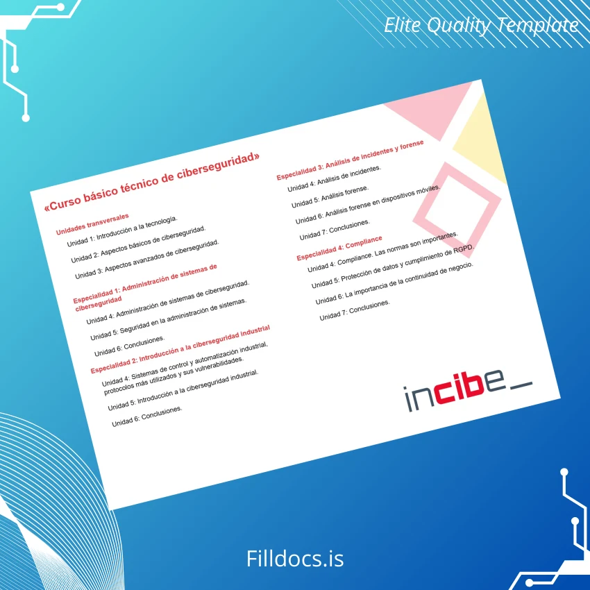 The Spain INCIBE Basic Technical Course in Cybersecurity Diploma Template – Word/PDF is a high-quality, customizable digital diploma designed for professionals seeking a seamless and professional diploma replacement or novelty certificate. This fillable document offers a practical solution for individuals needing a clean, editable diploma for presentation, validation, or record-keeping in the cybersecurity field.