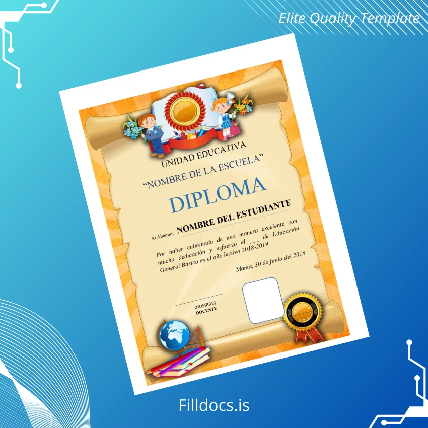 This template is an editable diploma form designed to replicate the official Spain Name of the School high school diploma, offering a seamless way to create a replacement or novelty diploma. It ensures accurate formatting and design authenticity while allowing users to input their information digitally. Ideal for creative professionals, educators, or anyone seeking a customizable degree template, it simplifies diploma generation without sacrificing quality.