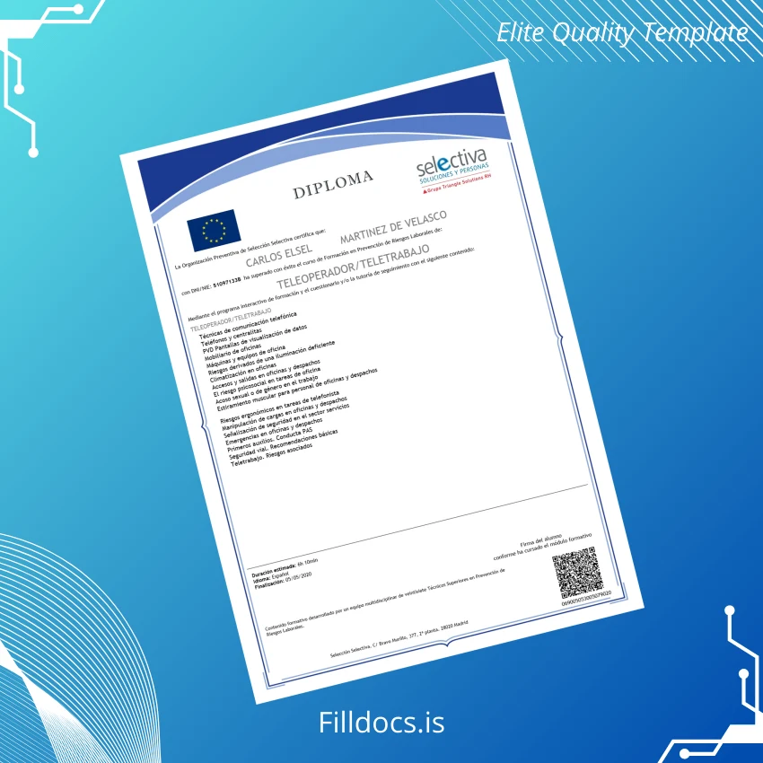 This Spain Selectiva Formación Teleoperador_Teletrabajo Diploma Template – Word/PDF is a premium fillable document designed to help professionals quickly customize and generate official-looking diplomas with ease. Crafted for teleoperators and remote workers, this digital diploma download offers a versatile and polished solution for those needing a reliable replacement or novelty diploma design that fits diverse professional scenarios.