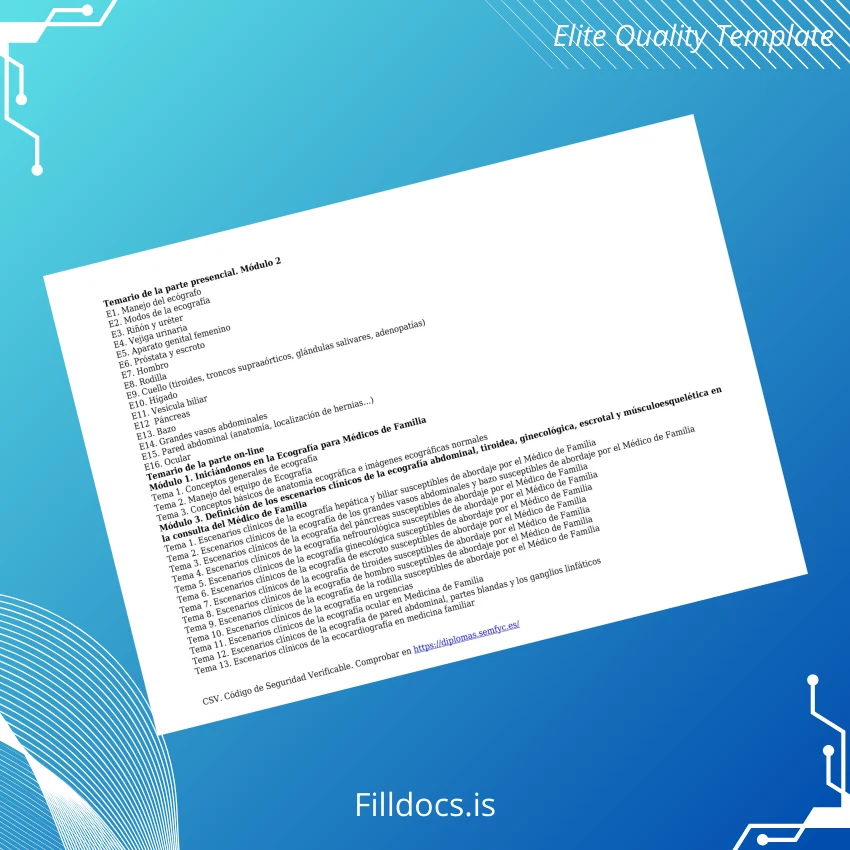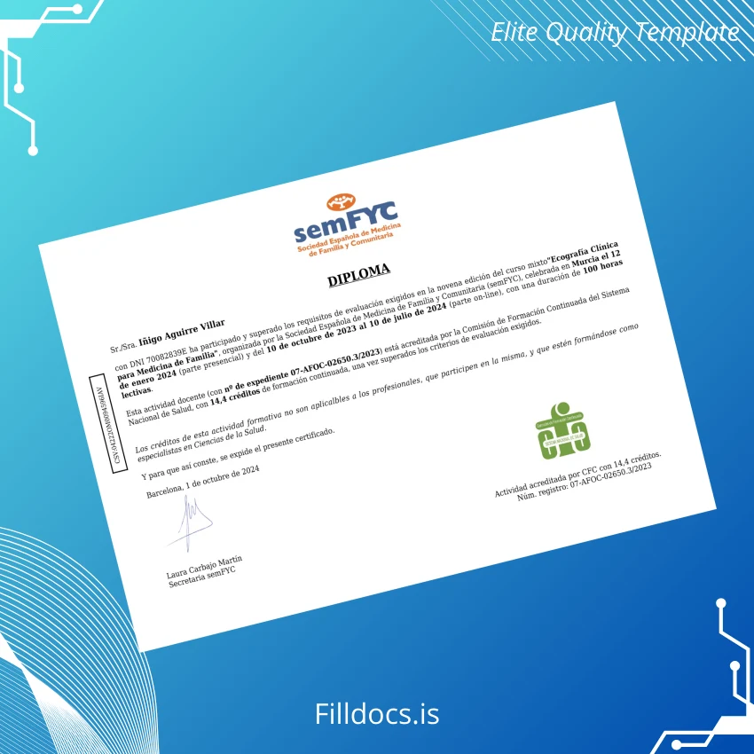 Discover the Spain Society of Family and Community Medicine Clinical Echography Diploma Template – Word/PDF, a meticulously designed fillable diploma form crafted for medical professionals seeking a reliable and customizable certificate solution. This digital diploma download is ideal for those needing a professional replacement diploma template or creating an official-looking certificate with ease.