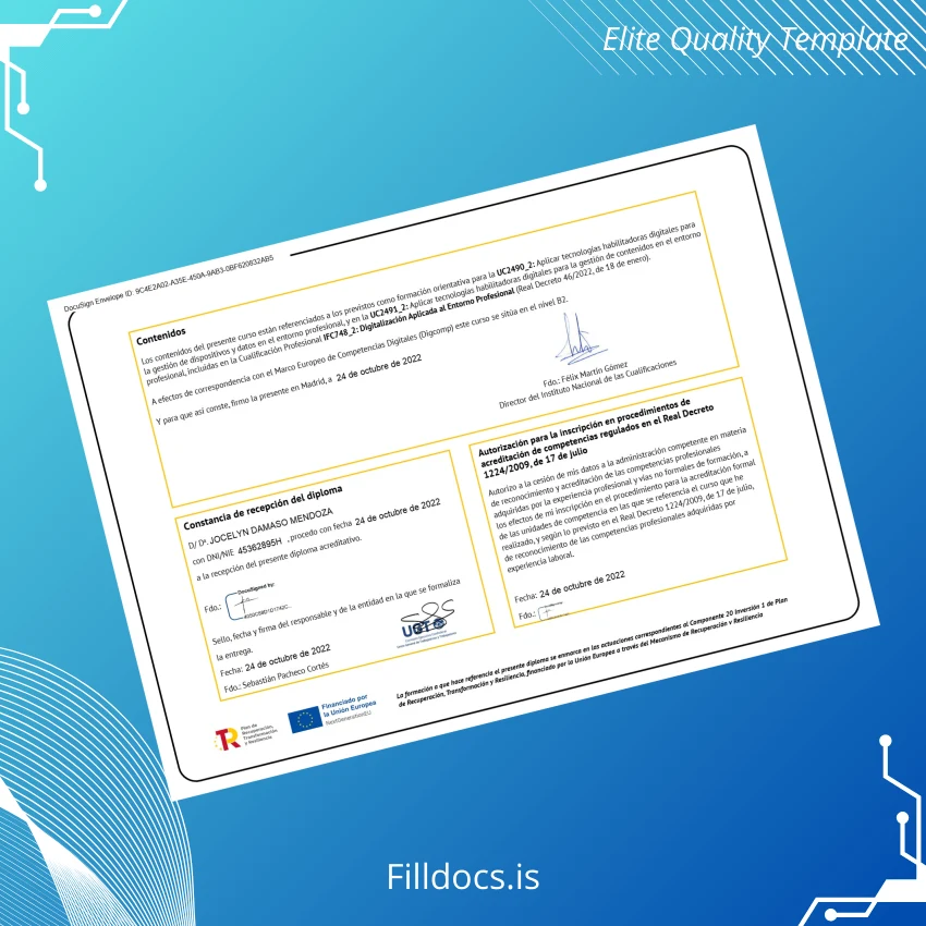 This editable diploma template provides a blank diploma form that can be customized to replicate the Spain Union General of Workers UGT certificate accurately. It serves as a replacement diploma template suitable for professionals needing a reliable, visually authentic document for reissuance or presentation.