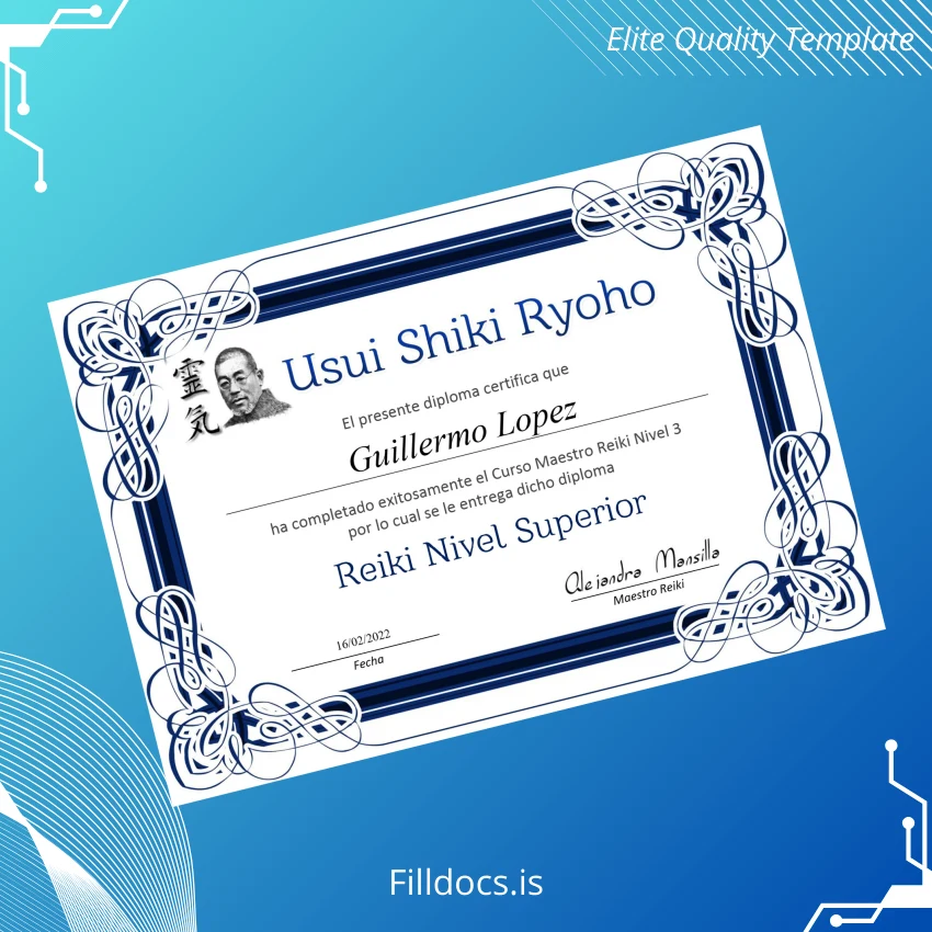 Fillable Spain Usui Shiki Ryoho Reiki Master Course Level 3 Diploma Template – Word/PDF for easy, professional customization and high-quality printing.
