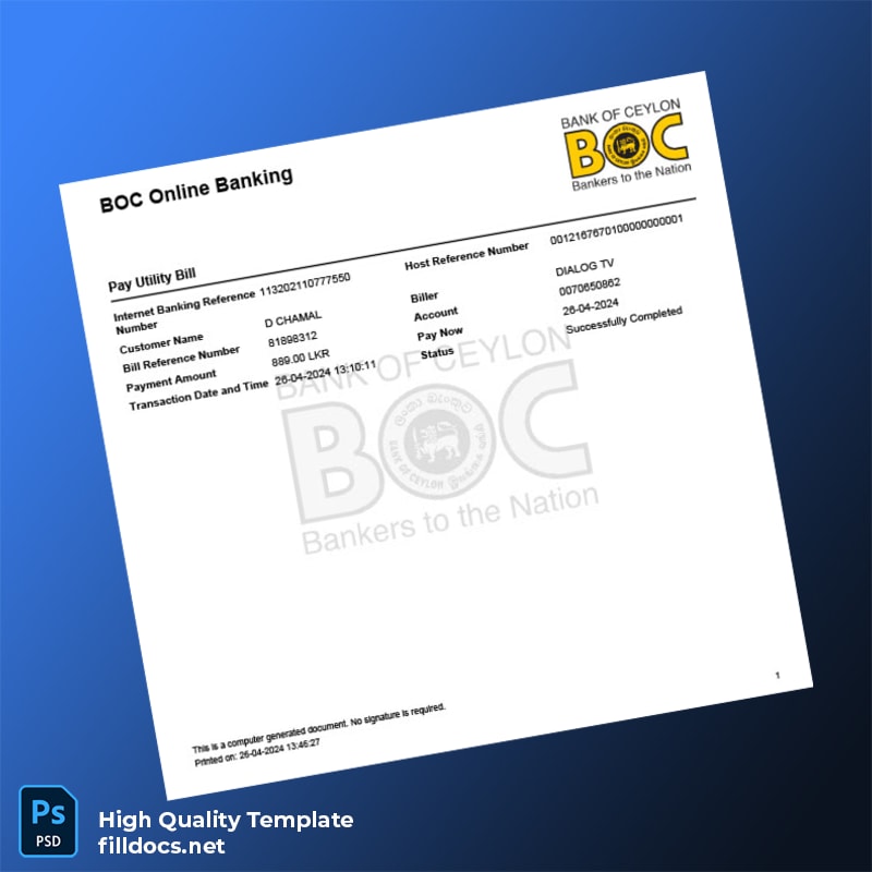 - Pre-formatted Sri Lanka Bank Of Ceylon branding for authentic utility bill appearance.