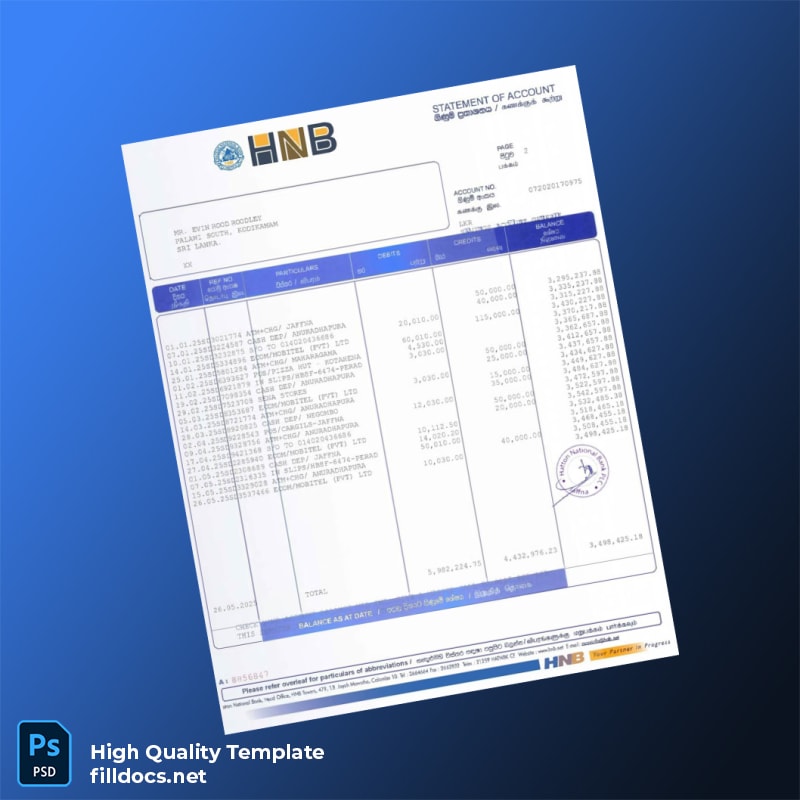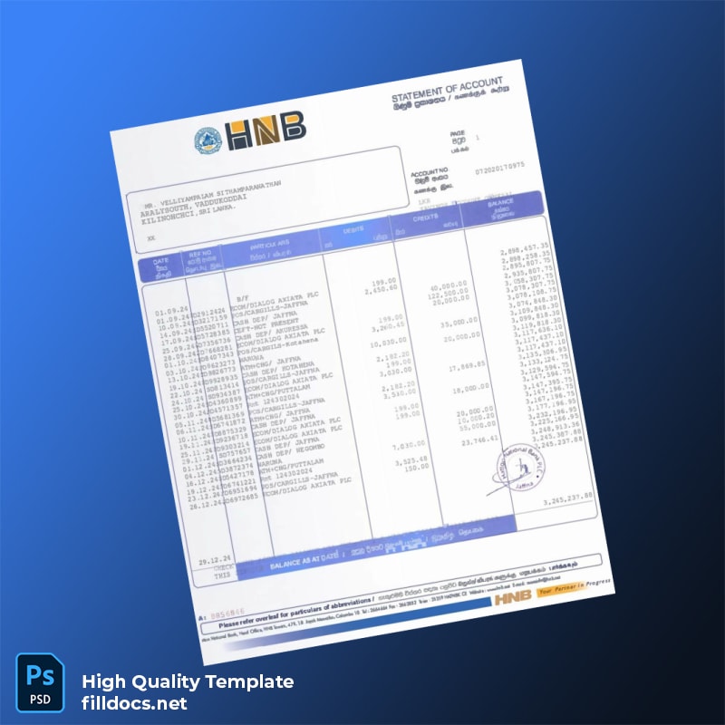 Sri Lanka HNB Bank Statement Template in Word and PDF Formats