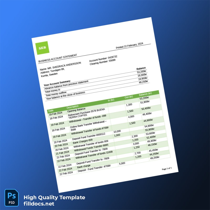 Imagine losing your essential bank statement, leaving you feeling stressed and unprepared for important applications. That’s precisely the situation Emma found herself in. Struggling to find a quick solution, she discovered the editable bank statement template, helping her recreate her lost document within moments. With our Sweden SEB Bank Statement Template, you can tackle financial paperwork while saving time and maintaining professionalism.