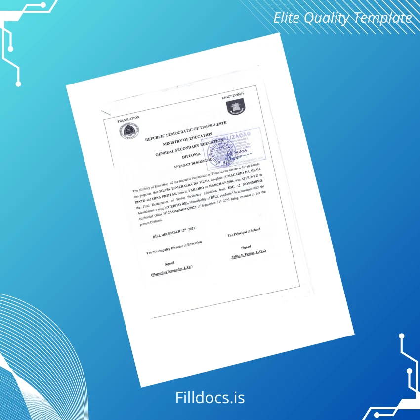 Discover the Timor-Leste Ministry of Education General Secondary Education Diploma Template – Word/PDF, a professionally designed, fillable document tailored for educators, institutions, and graduates. This digital diploma download simplifies the process of producing authentic, editable certificates with ease, combining high-quality design with functional flexibility to meet official education standards.