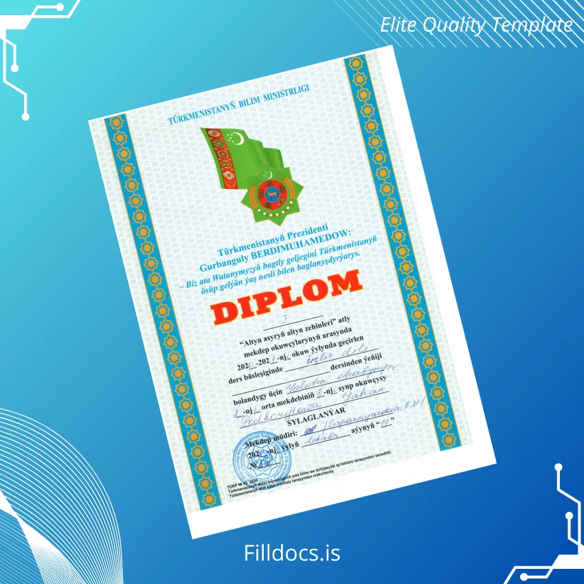 This editable diploma template is a high-quality digital file crafted specifically for the Turkmenistan Turkmenistan Institute honorary diplomas. It is a clean, professional blank diploma form designed to resemble official documents, allowing users to create stunning certificates with authentic appeal. The template’s layout follows formal diploma design conventions, incorporating elegant borders, classic typography, and space for signatures and seals.