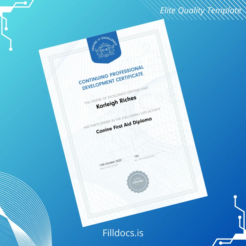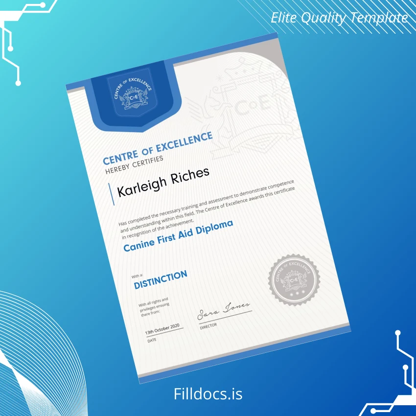 Discover the professional UK Centre of Excellence Canine First Aid Diploma Template – Word/PDF, a high-quality digital diploma designed specifically for veterinary professionals, trainers, and canine care specialists. This fillable and customizable degree template provides an ideal solution for anyone needing a quick, elegant replacement or a supplementary diploma certificate. Whether you’ve lost the original document, require a personalized certificate for your training program, or seek a novelty diploma design that matches your standards, this template offers a reliable and flexible resource.