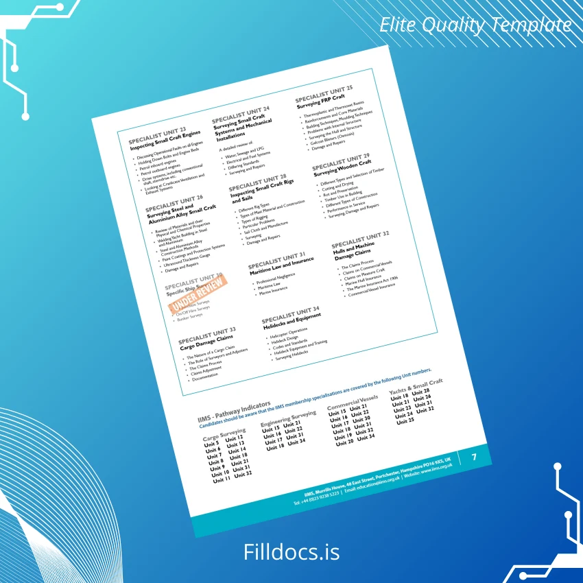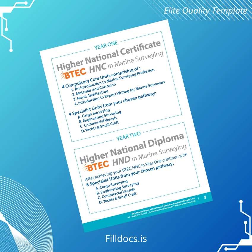 This template is a fully editable and print-ready Higher National Certificate in Marine Surveying issued by the UK International Institute of Marine Surveying, provided in compatible Word and PDF formats. It serves as a blank diploma form that can be customized swiftly for various needs such as replacements or official presentations, using a sophisticated and novel diploma design that honors professional standards.