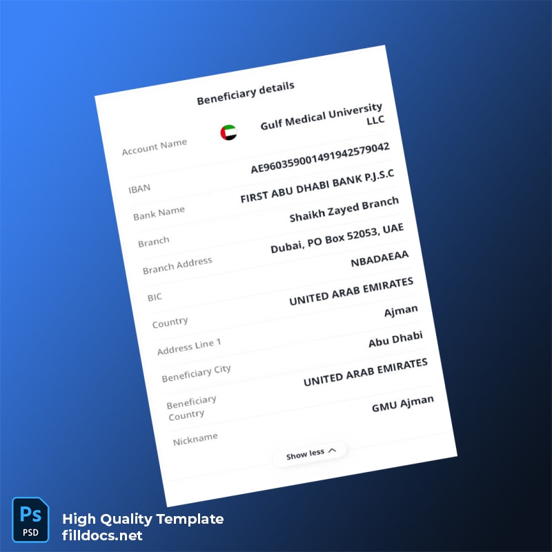 The United Arab Emirates Gulf M-1 Editable Transfer Receipt Template is a professional, easy-to-use document designed for individuals and businesses needing a reliable utility bill proof of address template. Available in both Word and PDF formats, this editable utility bill template ensures quick customization and seamless use, helping you present valid address proof with confidence and convenience.