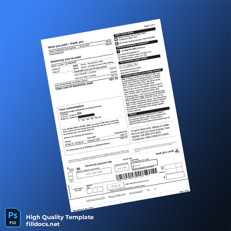 United Kingdom British Gas Trading Ltd Editable Electricity Bill Template in Word and PDF formats 2 page