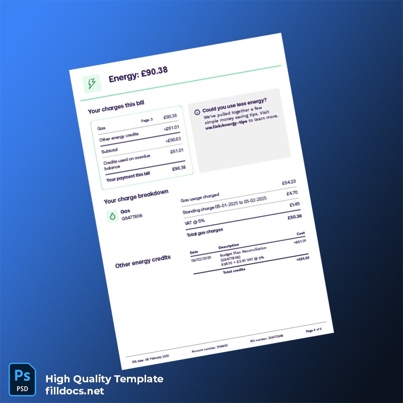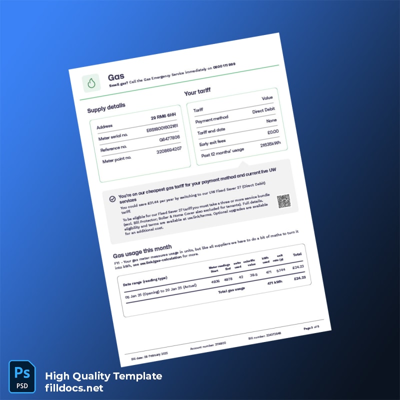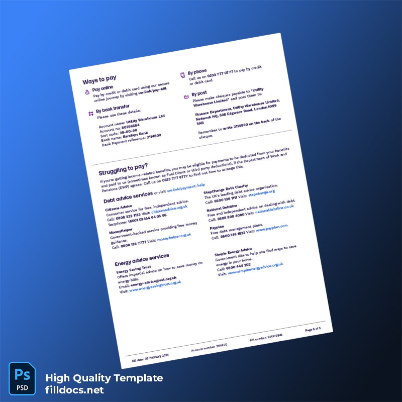 United Kingdom UW Editable Utility Bill Template in Word and PDF formats 5 page