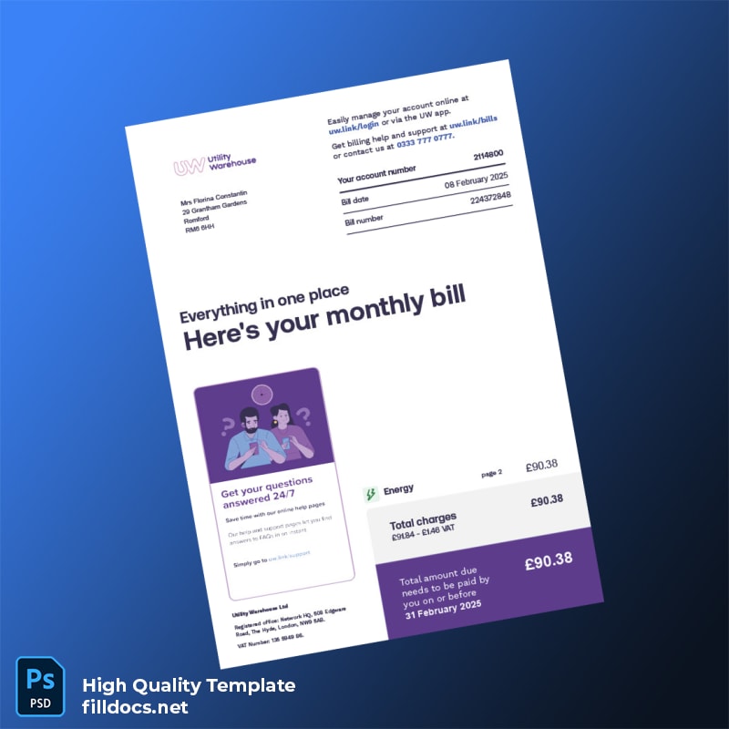 Effortlessly create a professional and customizable utility bill proof of address with the United Kingdom UW Editable Utility Bill Template, available in both Word and PDF formats. Designed to meet UK standards, this versatile template offers a reliable solution for quickly generating legitimate-looking utility bills for various official needs.