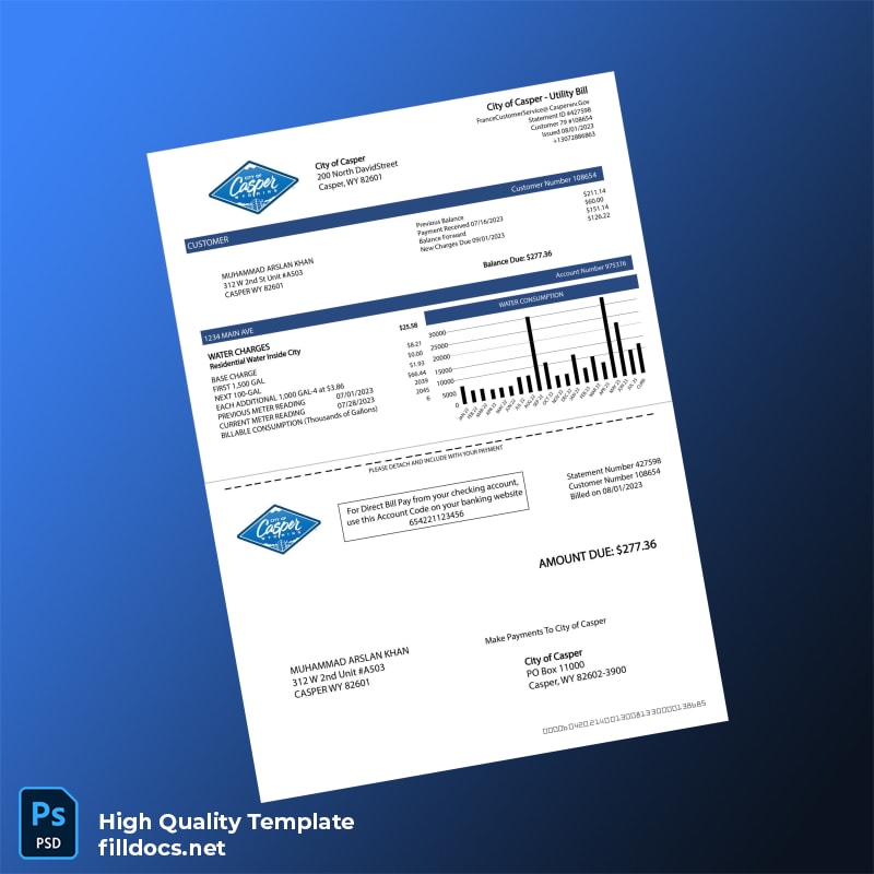 United States City Of Casper Editable Water Bill Template in Word and PDF Formats