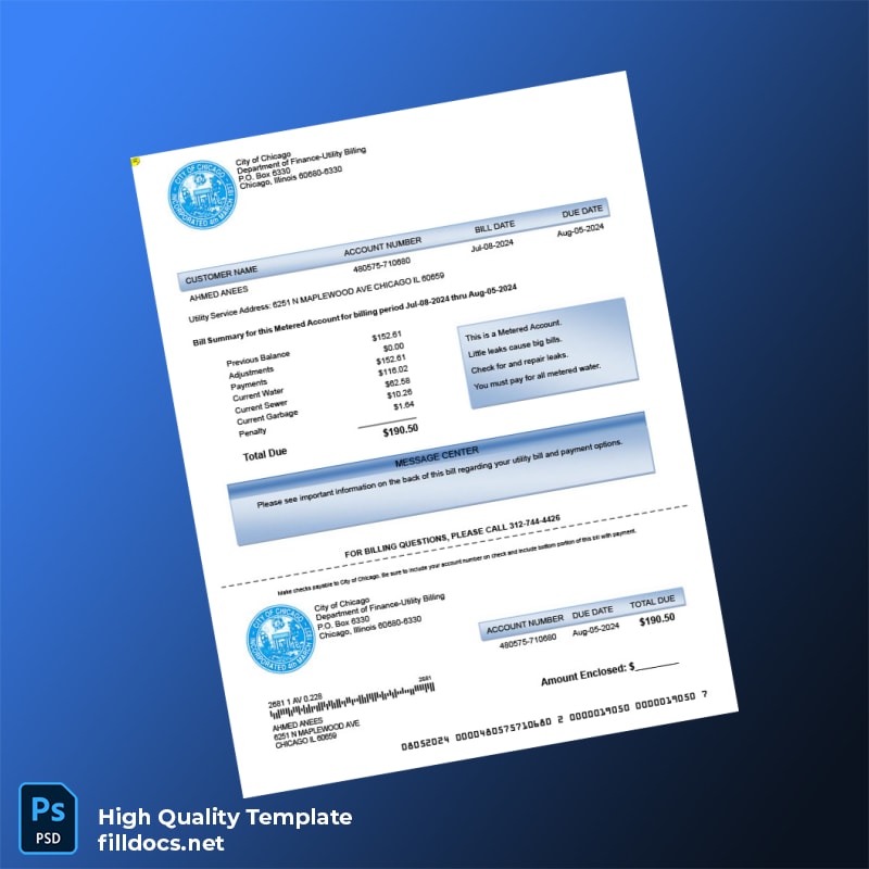 United States City Of Chicago Department Of Finance-Utility Billing Editable Metered Bill Template