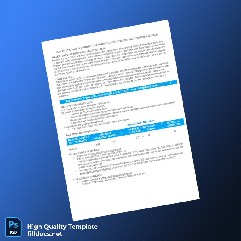 United States City Of Chicago Department Of Finance-Utility Billing Editable Utility Bill Template in Word and PDF formats 2 page