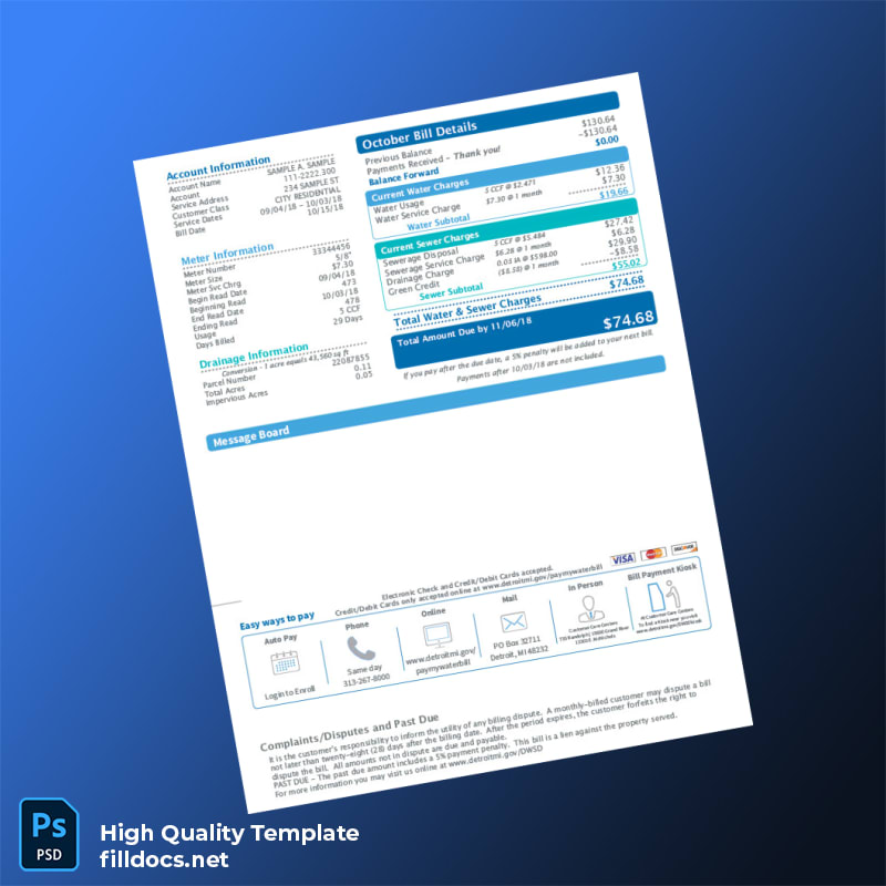 United States City Of Detroit Water And Sewerage Department Editable Water Bill Template