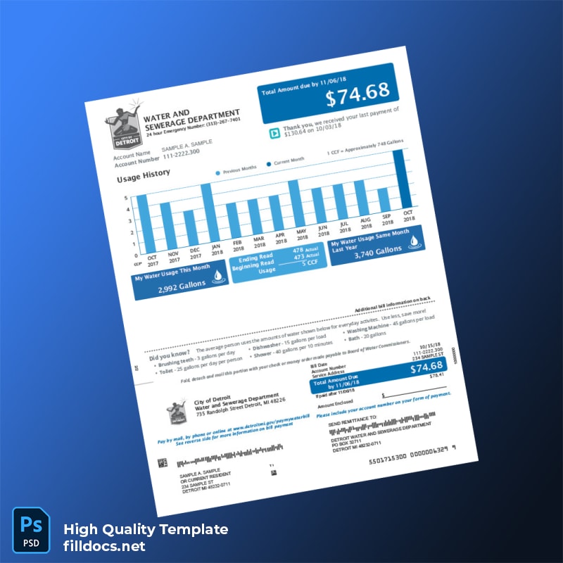 This professional editable template offers a reliable solution for creating authentic-looking water bills in Word and PDF formats. Designed specifically for the United States City of Detroit Water and Sewerage Department, this template serves as an efficient utility bill proof of address document that you can customize fully to meet your verification or documentation needs.